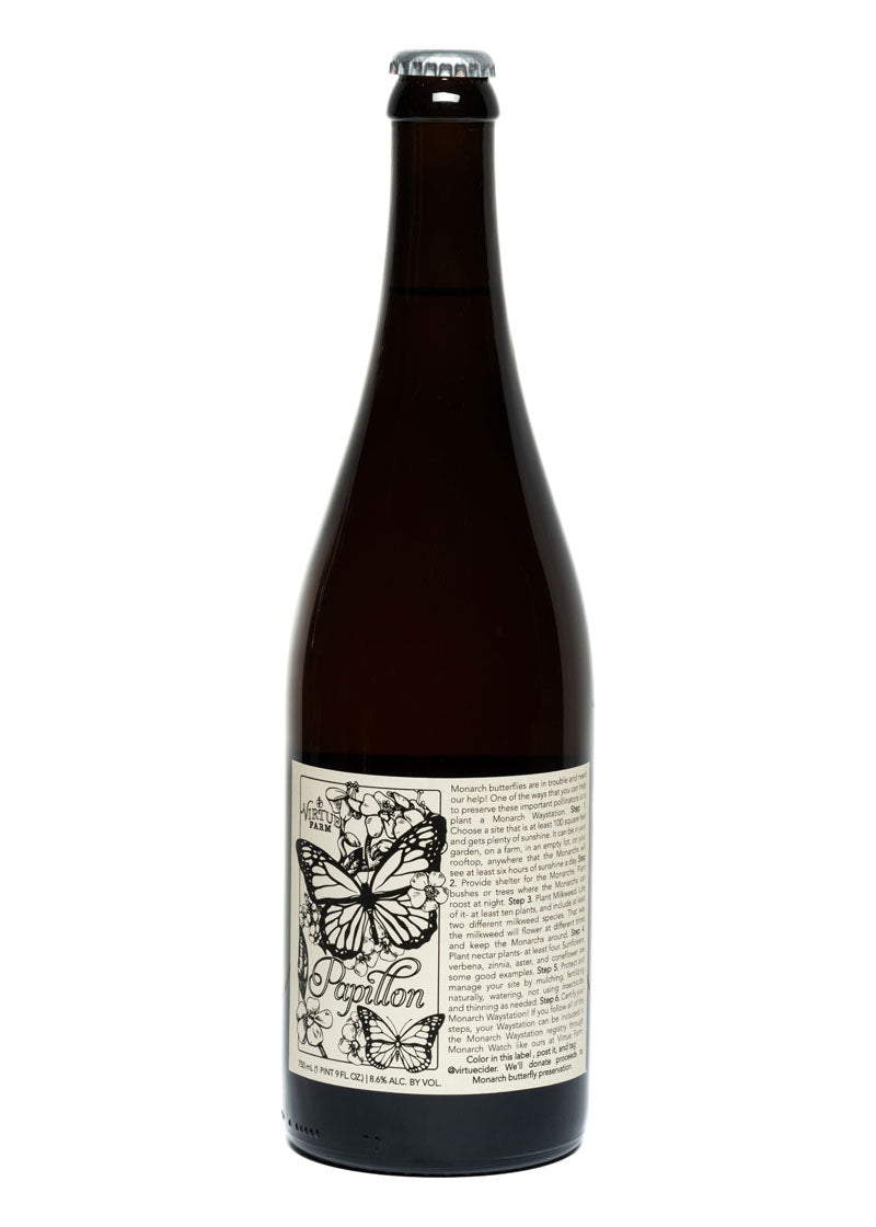 Papillion is a tribute to the near-endangered Monarch butterfly. Virtue Farm is home to an extensive and growing butterfly waystation, which are also rare these days as insecticides and over mowing eliminates breeding ground and living space for pollinators. Papillon invites you to be a part of the solution- color in the label and tag Virtue- we will donate a portion of the proceeds to a local butterfly preservation society. Want to do more? Follow the instructions on the label for how you can grow your own butterfly waystation.