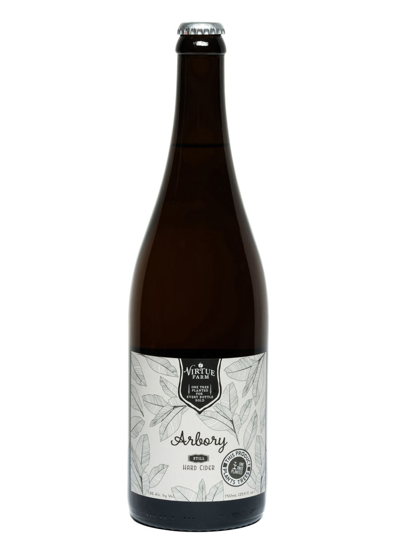 This still cider named for a Parish on the Island of Man is a tribute to the most virtuous of fauna - the tree. Arbory is a collaboration with One Tree Planted - an organization that plants trees all over the world and will launch on Earth Day on April 22, 2022 - just in time for Arbor Day. Each bottle of Arbory plants one tree in Roy Creek Michigan with our partners One Tree Planted. Virtue Cider buys hand-picked heirloom apples from local farmers to press, ferment and age at our farm to become complex ciders. The pressed remains of the fruit is called pomace. Some of the pomace is fed to our farm animals as feed. The animals then fertilize and till the soil. A portion of the pomace is spread in what we call our “volunteer orchard”. The seeds in the pomace germinate in the soil and then grow to become saplings that we replant on our farm, donate to urban farms and plant at bars and restaurants with patios.